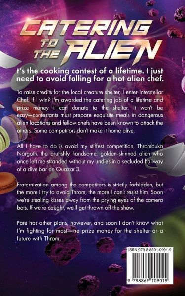 It's the cooking contest of a lifetime. I just need to avoid falling for a hot alien chef. To raise credits for the local creature shelter, I enter Interstellar Chef. If I win? I'm awarded the catering job of a lifetime and prize money I can donate to the shelter. It won't be easy-contestants must prepare exquisite meals in dangerous alien locations and fellow chefs have been known to attack the others. Some competitors don't make it home alive. All I have to do is avoid my stiffest competition, Thrombuka Nargoth, the brutishly handsome, golden-skinned alien who once left me stranded without my undies in a secluded hallway of a dive bar on Quazar 3. Fraternization among the competitors is strictly forbidden, but the more I try to avoid Throm, the more I can't resist him. Soon we're stealing kisses away from the prying eyes of the camera bots. If we're caught, we'll get thrown off the show. Fate has other plans, however, and soon I don't know what I'm fighting for most-the prize money for the shelter or a future with Throm.