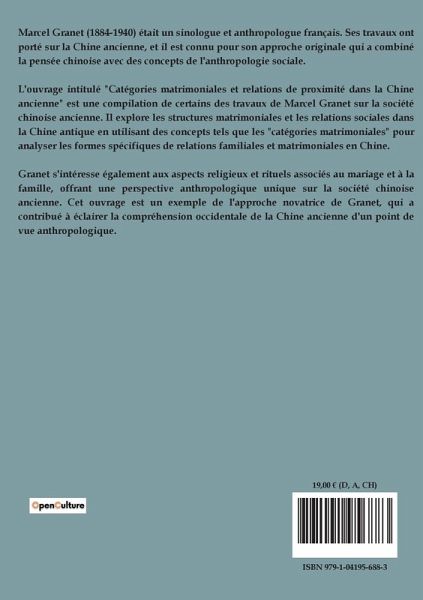 Marcel Granet (1884-1940) était un sinologue et anthropologue français. Ses travaux ont porté sur la Chine ancienne, et il est connu pour son approche originale qui a combiné la pensée chinoise avec des concepts de l'anthropologie sociale. L'ouvrage intitulé "Catégories matrimoniales et relations de proximité dans la Chine ancienne" est une compilation de certains des travaux de Marcel Granet sur la société chinoise ancienne. Il explore les structures matrimoniales et les relations sociales dans la Chine antique en utilisant des concepts tels que les "catégories matrimoniales" pour analyser les formes spécifiques de relations familiales et matrimoniales en Chine. Granet s'intéresse également aux aspects religieux et rituels associés au mariage et à la famille, offrant une perspective anthropologique unique sur la société chinoise ancienne. Cet ouvrage est un exemple de l'approche novatrice de Granet, qui a contribué à éclairer la compréhension occidentale de la Chine ancienne d'un point de vue anthropologique.