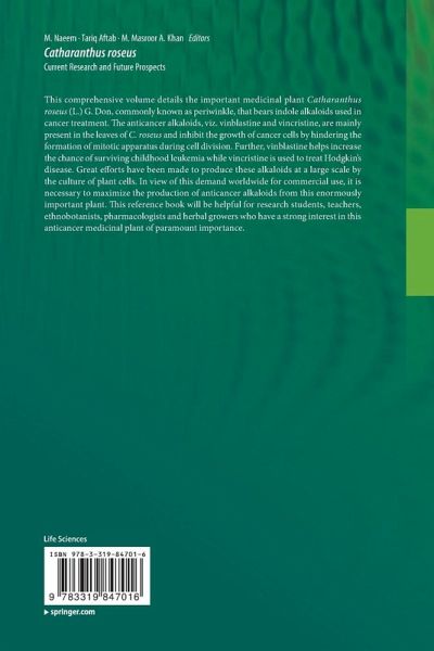 1.Strategies for enhancing alkaloids yield in Catharanthus roseus via Metabolic Engineering Approaches (Kexuan Tang and Qifang Pan).- 2.In vitro biotechnological production & pharmacological studies of anti-leukemic alkaloids of Catharanthus roseus (Hebert Jair Barrales Cureño,Petra Andrade Hoyos, Alfonso Luna Cruz, Cesar Reyes Reyes, Salvador Chávez Salinas and Luis German Valdez López).- 3.Plant efficiency and alkaloids production in Sadabahar (Catharanthus roseus L.): Role of potent PGRs and mineral nutrients (M. Naeem1, Tariq Aftab1, Mohd. Idrees, M. Masidur Alam, M. Masroor A. Khan and Moinuddin).- 4. Role of Biotechnology in Alkaloids Production (Amjad Khalil).- 5.Agricultural, pharmaceutical & Therapeutic Interior of Catharanthus Roseus (L.) (Md. Abul Barkat1, Harshita and Md. Akhlaquer Rahman).- 6.Elicitation enhances alkaloid yield in Catharanthus roseus (Dipti Tonk, A. Mujib, Muzamil Ali and Nadia Zafar).- 7. Catharanthus roseus: The Cancer-fighting Medicine (D. Sathya Prabhu, V. Devi Rajeswari).- 8. In vitro studies, biosynthesis of secondary metabolites and pharmacological utility of Catharanthus roseus (L.) Don. - A review (P. Senbagalakshmi1, M.V. Rao and T. Senthil Kumar).- 9. Therapeutic efficacy of Catharanthus roseus in Type 1 and Type 2 diabetes mellitus in wistar rats (Rasineni Karuna1, Gujjala Sudhakar, Sagree Saisree, Putakala Mallaiah, Bongu Sasibhusana Rao, Bellamkonda Ramesh, S. Sreenivasa Reddy and Desireddy Saralakumari).- 10. Biotechnological interventions to modulate terpenoid indole alkaloid pathway in Catharanthus roseus using in vitro tools and approaches (Priyanka Verma, Shamshad Ahmad Khan, Varsha Parasharami and Ajay Kumar Mathur).- 11. Vincristine and Vinblastine anticancer Catharanthus alkaloids: Pharmacological applications and strategies for yield improvement (Masidur Alam, M. Naeem, M. Masroor A. Khan and Moin Uddin).- 12. Role of PGRs in anticancer alkaloids (vincristine & vinblastine) production (Jagjit Kaur, Apoorva Singh, Teena Pathak and Kuldeep Kumar).- 13. The accumulation and degradation of alkaloids in Catharanthus roseus supported by various external agents under different environmental conditions (Mohd Idrees, Israr Ul Hassan, M. Naeem, Akbar Ali, Tariq Aftab, M. Masroor A. Khan).- 14. Catharanthus roseus: Detoxification and hepatic protection of Aflatoxin B1 (S. Patharajan1, S. Bala Abirami, R. Elangomathavan and S. Ramesh).- 15. Potential of Catharanthus roseus (L.): phytoremediation of Heavy Metals (V. Subhashini* and A.V.V.S. Swamy).- 16. Unraveling the cumulative effect of soil-applied Radiation-processed sodium alginate and polyacrylamide on growth attributes, physiological activities and alkaloids production in periwinkle [Catharanthus roseus (L.) G. Don] (Asfia Shabbir, Akbar Ali, Yawar Sadiq, Hasan Jaleel, Bilal Ahmad, M. Naeem, M. Masroor A. Khan and Moinuddin).- 17. Catharanthus roseus - Cultivation under Stress Conditions (Sanjeev Pandey).- 18. The study of the effect of nickelheavy metal on some growth parameters and production of alkaloid in Catharantus roseus (Matin Arefi Fard).