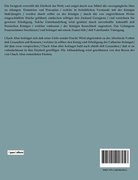 Die Ewigkeit verwirfft die Eitelkeit der Welt; vnd zeiget durch was Mittel die vnvergängliche Ehre zu erlangen. Demetrius vnd Procopius / welche in heimblichen Verstande mit der Königin Statt-Jungfer / werden durch selbte zu der Königin / durch die von zugerichtetem Weine eingeschläffete Wache geführet; entdecken selbiger den Zustand Georgiens / vnd versichern Sie gewisser Erledigung. Solche Unterhandelung wird gestöret durch unverhoffte Ankunfft deß Persischen Königes / welcher vmbsonst / der Königin Keuschheit zugesetzet. Das Gefangene Frauenzimmer beschleust / vnd beklaget mit einem Trauer-lide / deß Vaterlandes Vntergang. Chach Abas beklaget sich daß seine Liebe sonder Frucht. Wird abgefordert zu der Abschieds Verhör deß Gesandten auß Reussen / welcher in selbter den König vmb Erledigung der Catharine belanget / die jhm zwar versprochen / Chach Abas aber beklaget bald nach abtritt deß Gesandten / daß er zu vnbedachtsam in ihre Freyheit gewilliget. Die Abhandelung wird geschlossen von den Reyen der von Chach Abas ermordeten Fürsten.