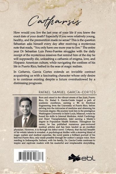 How would you live the last year of your life if you knew the exact date of your death? Especially if you were relatively young, healthy, and the premonition made no sense? This is the question Sebastian asks himself every day after receiving a mysterious note that reads, "You only have one more year to live." The entire year Dr Sebastian Luis Perez-Fuertes struggles with the daily receipt of the mysterious missives that remind him of the day he will supposedly die, unleashing a catharsis of enigma, love, and Hispanic American culture, while navigating the confines of his life in Puerto Rico, bathed in the seas of magic realism. In "Catharsis", Garcia Cortes extends an invisible contract acquainting us with a fascinating character whose only desire is to continue existing despite a future overshadowed by a distressing prognosis.