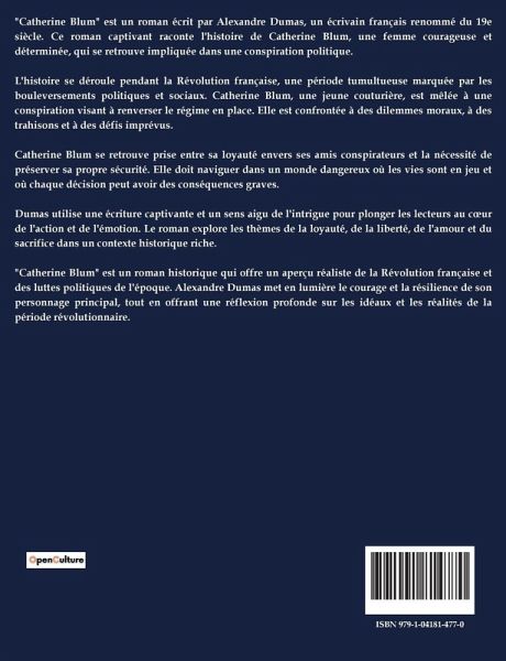 "Catherine Blum" est un roman écrit par Alexandre Dumas, un écrivain français renommé du 19e siècle. Ce roman captivant raconte l'histoire de Catherine Blum, une femme courageuse et déterminée, qui se retrouve impliquée dans une conspiration politique. L'histoire se déroule pendant la Révolution française, une période tumultueuse marquée par les bouleversements politiques et sociaux. Catherine Blum, une jeune couturière, est mêlée à une conspiration visant à renverser le régime en place. Elle est confrontée à des dilemmes moraux, à des trahisons et à des défis imprévus. Catherine Blum se retrouve prise entre sa loyauté envers ses amis conspirateurs et la nécessité de préserver sa propre sécurité. Elle doit naviguer dans un monde dangereux où les vies sont en jeu et où chaque décision peut avoir des conséquences graves. Dumas utilise une écriture captivante et un sens aigu de l'intrigue pour plonger les lecteurs au c¿ur de l'action et de l'émotion. Le roman explore les thèmes de la loyauté, de la liberté, de l'amour et du sacrifice dans un contexte historique riche. "Catherine Blum" est un roman historique qui offre un aperçu réaliste de la Révolution française et des luttes politiques de l'époque. Alexandre Dumas met en lumière le courage et la résilience de son personnage principal, tout en offrant une réflexion profonde sur les idéaux et les réalités de la période révolutionnaire.
