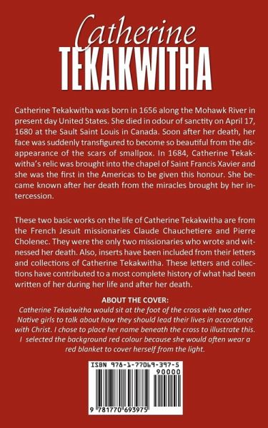 Catherine Tekakwitha was born in 1656 along the Mohawk River in present day United States. She died in odour of sanctity on April 17, 1680 at the Sault Saint Louis in Canada. Soon after her death, her face was suddenly transfigured to become so beautiful from the disappearance of the scars of smallpox. In 1684, Catherine Tekakwitha's relic was brought into the chapel of Saint Francis Xavier and she was the first in the Americas to be given this honour. She became known after her death from the miracles brought by her intercession. These two basic works on the life of Catherine Tekakwitha are from the French Jesuit missionaries Claude Chauchetiere and Pierre Cholenec. They were the only two missionaries who wrote and witnessed her death. Also, inserts have been included from their letters and collections of Catherine Tekakwitha. These letters and collections have contributed to a most complete history of what had been written of her during her life and after her death. About the cover: Catherine Tekakwitha would sit at the foot of the cross with two other Native girls to talk about how they should lead their lives in accordance with Christ. I chose to place her name beneath the cross to illustrate this. I selected the background red colour because she would often wear a red blanket to cover herself from the light.