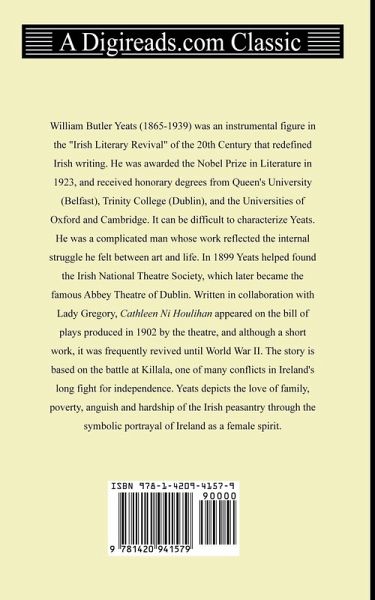 William Butler Yeats (1865-1939) was an instrumental figure in the "Irish Literary Revival" of the 20th Century that redefined Irish writing. He was awarded the Nobel Prize in Literature in 1923, and received honorary degrees from Queen's University (Belfast), Trinity College (Dublin), and the Universities of Oxford and Cambridge. It can be difficult to characterize Yeats. He was a complicated man whose work reflected the internal struggle he felt between art and life. In 1899 Yeats helped found the Irish National Theatre Society, which later became the famous Abbey Theatre of Dublin. Written in collaboration with Lady Gregory, "Cathleen Ni Houlihan" appeared on the bill of plays produced in 1902 by the theatre, and although a short work, it was frequently revived until World War II. The story is based on the battle at Killala, one of many conflicts in Ireland's long fight for independence. Yeats depicts the love of family, poverty, anguish and hardship of the Irish peasantry through the symbolic portrayal of Ireland as a female spirit.