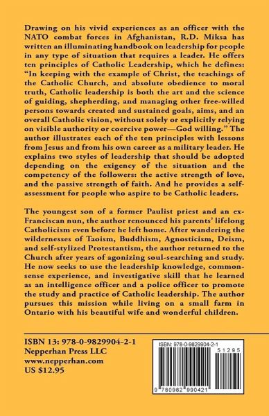 Drawing on his experiences with the NATO forces in Afghanistan, R.D. Miksa has written an illuminating handbook on leadership for people in any type of situation. He offers ten principles of Catholic Leadership, and he illustrates each of these principles with lessons from Jesus and from his own career as a military leader. He explains two styles of leadership that should be adopted depending on the exigency of the situation and the competency of the followers: the active strength of love, and the passive strength of faith. And he provides a self-assessment for people who aspire to be Catholic leaders.