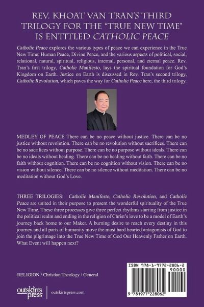Rev. Khoat Van Tran's third trilogy to prepare us for the True New Time on Earth is entitled "Catholic Peace." "Catholic Peace" explores the various types of peace we can experience in God The Father's True New Time on Earth: Human Peace, Divine Peace, and the various aspects of political, social, relational, natural, spiritual, religious, internal, personal, and eternal peace. Rev. Tran's first trilogy, "Catholic Manifesto," lays the spiritual foundation for God's Kingdom on Earth, known in the True New Time as the "Glorious Reign of Peace." Peace is a fruit of Justice, and the implementation of this Justice on Earth is discussed in Rev. Tran's second trilogy, "Catholic Revolution," which paves the way for "Catholic Peace" here, the third trilogy for God The Father's True New Time on Earth. Have you ever wondered what the people of the Old Testament knew in advance about Jesus and His life on Earth? In Catholic Peace, Rev. Khoat Tran matches the foreknowledge of the Old Testament with the corresponding fulfilling passages of the New Testament regarding the Incarnation, Passion, Crucifixion, and Resurrection of Jesus. Finally, Rev. Tran discusses the roles of Our Blessed Mother Mary in Heaven as Co-Redemptrix, Mediatrix, and Advocate. He references the Virgin Mary’s "ripe fall of Newton’s apple" pertaining to Her Assumption into Heaven as something to be studied by all of us on Earth. This book gives an intensive study of Our Lady’s character and virtues so that we can understand and appreciate Her triumph of the Glorious Reign of Peace on Earth coming soon in the True New Time. This book prepares all of us in the faith we need to embrace this True New Time.