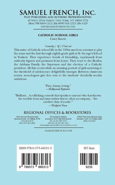 Casey Kurtti Full Length, Comedy Characters: 4 female Unit set. This satire of Catholic school life in the 1960's uses four actresses to play the nuns and the first through eighth grade girls at St. George's School in Yonkers. As they experience bonds of friendship, reprimands from authority figures and pressures from home and they react to the Beatles, the Addams Family, the Supremes and the election of a Catholic president, an amusing portrait of girls maturing to