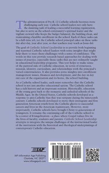 A volume in Research on Religion and Education Series Editors: Larry Burton and Anthony J. Dosen The administration of Pre K - 12 Catholic schools becomes more challenging each year. Catholic school leaders not only have the daunting task of leading a successful learning organization, but also to serve as the school community's spiritual leader and the vigilant steward who keeps the budget balanced, the building clean, and maintaining a healthy enrollment in the school. Each of these tasks can be a full time job, yet the Catholic school principal takes on these tasks day after day, year after year, so that teachers may teach as Jesus did. The goal of this book is to provide both beginning and seasoned Catholic school leaders with some insights that might help them to meet these challenges with a sense of confidence. The words in this text provide research¿based approaches for dealing with issues of practice, especially those tasks that are not ordinarily taught in educational leadership programs. This text helps to make sense of the pastoral side of Catholic education, in terms of structures, mission, identity, curriculum, and relationships with the principal's varied constituencies. It also provides some insights into enrollment management issues, finances and development, and the day in day out care of the organization and its home, the school building. As a Catholic school leader, each must remember that the Catholic school is not just another educational option. The Catholic school has a rich history and an important mission. Historically, education of the young goes back to the monastic and cathedral schools of the Middle Ages. In the United States, Catholic schools developed as a response to anti¿Catholic bias that was rampant during the nineteenth century. Catholic schools developed to move their immigrant and first generation American youth from the Catholic ghetto to successful careers and lives in the American mainstream. However, most importantly, Catholic schools have brought Christ to generations of youngsters. It remains the continuing call of the Catholic school to be a center of Evangelization-a place where Gospel values live in the lives of faculty, students and parents. This text attempts to integrate the unique challenges of the instructional leader of the institution with the historical and theological underpinnings of contemporary Catholic education.