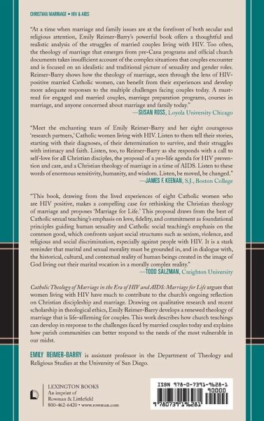 Marriage for Life begins by listening to the lived experiences of Catholic, married, HIV-positive women, in order to better understand their struggles. The eight women interviewed in Chicago, Illinois, USA, shared their stories of marriage, of family life, of church involvement, and of living with HIV. Their candid reflections offer a fresh and grounded perspective on the challenges of living with HIV in a US context. After listening to and learning from these women’s experiences, Reimer-Barry constructs a theology of Christian marriage that is life-giving in a world with AIDS. While Catholic teachings have developed and now affirm the equal dignity of women and men, troubling legacies of women’s subordination remain embedded in liturgical practices and theological texts. Arguing that self-care is an indispensable component of a healthy marriage, Reimer-Barry constructs a life-affirming theology of marriage that is sensitive to the struggles of her collaborators. She argues that marriage for life must promote the full flourishing of both partners, respect wives as equal partners with their husbands, and offer a coherent and empowering sexual ethic. Building on the wisdom of her collaborators’ lived experiences, Reimer-Barry examines the need for a more adequate Catholic response to HIV and AIDS, arguing that church communities should promote comprehensive sexual education, affirm both abstinence and condom use for HIV prevention, and actively work to reduce stigmatizing behaviors within church communities. She also unpacks the implications of marriage for life for Catholic liturgical practice, marriage preparation programs, sexual education programs, and family ministries. Modeling her method on what Pope Francis calls the "art of accompaniment," Reimer-Barry argues that Catholic theology of marriage must be renewed and updated so that all can plainly understand that marriage is for life.