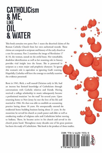 This book contains two parts: Part 1 states the doctrinal claims of the Roman Catholic Church from her own authorized records. These claims are compared to scripture and history of the early church as a test for accuracy. Part 2 examines the image of Revelation 17 & 18, the woman, seated on the awful beast. Her remarkable, doubtless identification as well as her stunning role in history provides vital insight into the future. She is presented in scripture as a most major and prophetic character. To ignore this woman's role is equivalent to ignoring God's warning. Hopefully, Catholics will have the courage to carefully examine the evidence presented. Born in 1941, Rich, a well rooted Christian early in life, had an interest but limited knowledge of Catholicism through conversations with Catholic relatives and friends. Having received a college scholarship in music subsequently became a professional musician "on the road" for several years. Upon returning home to New Jersey he met the love of his life and married in 1966. He then was able to establish an accounting practice lasting about 18 years. He unexpectedly entered the residential home building business lasting about 21 years. In the meantime he served his church as youth pastor and elder as well as conducting studies of religious cults and Catholicism before moving to Indiana. There, he became active in his church and served in the church praise band. Throughout many decades one of his great passions has been the study of Catholicism. This book is the product of those studies.