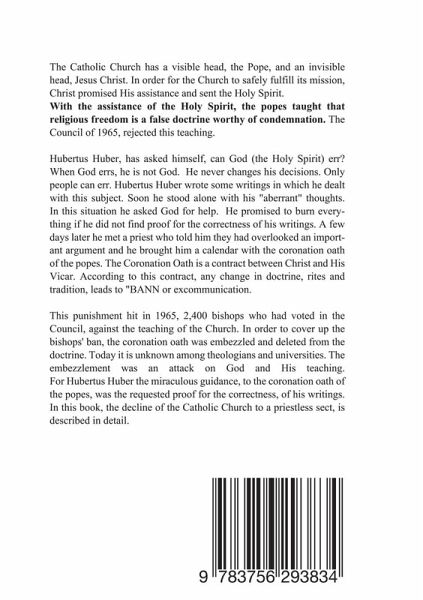 The Catholic Church has a visible head, the Pope, and an invisible head, Jesus Christ. In order for the Church to safely fulfill its mission, Christ promised His assistance and sent the Holy Spirit. With the assistance of the Holy Spirit, the popes taught that religious freedom is a false doctrine worthy of condemnation. The Council of 1965, rejected this teaching.Hubertus Huber, has asked himself, can God (the Holy Spirit) err? When God errs, he is not God. He never changes his decisions. Only people can err. Hubertus Huber wrote some writings in which he dealt with this subject. Soon he stood alone with his "aberrant" thoughts. In this situation he asked God for help. He promised to burn everything if he did not find proof for the correctness of his writings. A few days later he met a priest who told him they had overlooked an important argument and he brought him a calendar with the coronation oath of the popes. The Coronation Oath is a contract between Christ and His Vicar. According to this contract, any change in doctrine, rites and tradition, leads to "BANN or excommunication.This punishment hit in 1965, 2,400 bishops who had voted in the Council, against the teaching of the Church. In order to cover up the bishops' ban, the coronation oath was embezzled and deleted from the doctrine. Today it is unknown among theologians and universities. The embezzlement was an attack on God and His teaching.For Hubertus Huber the miraculous guidance, to the coronation oath of the popes, was the requested proof for the correctness, of his writings. In this book, the decline of the Catholic Church to a priestless sect, is described in detail.