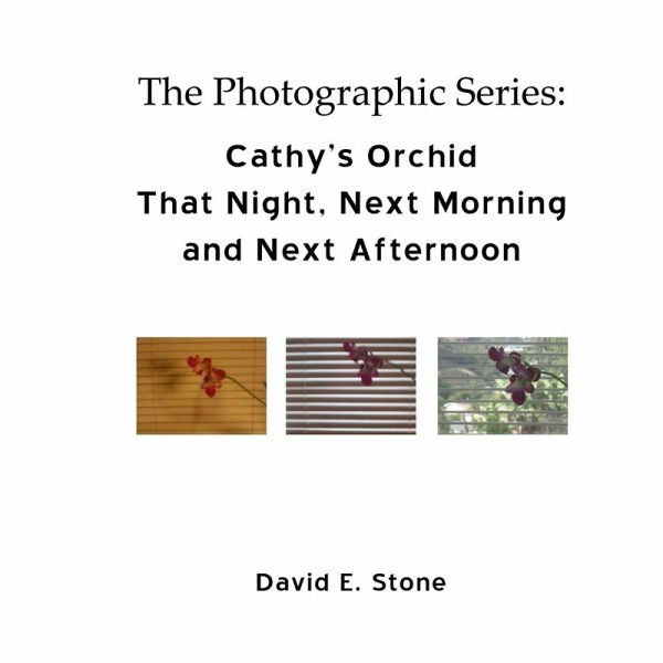 "Cathy's Orchid - That Night, Next Morning and Next Afternoon" is one book from a continuing collection by David E. Stone entitled "The Photographic Series". Over the course of one evening, the next morning & afternoon, David E. Stone photographed his wife's orchid plant in their kitchen and resulting images are distinctly different due to the changing light of each part of the day. The works in this series are all unique photographs taken in rapid succession of the same image, so the resulting images are possibly different from each other due to minor shifts in composition or focus. Due to the focus on uniqueness, The Photographic Series books are not intended to replicate or catalog the series (as they rarely include all of the proofs) and since they are not the original images, the artist considers them to be curated surveys of images from the series and as such, are recontextualized by the pairings for the purposes of being a book.