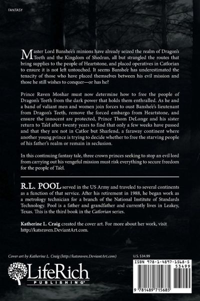 Master Lord Banshees minions have already seized the realm of Dragons Teeth and the Kingdom of Shedran, all but strangled the routes that bring supplies to the people of Heartstone, and placed operatives in Catlorian to ensure it is not le_ untouched. It seems Banshee has underestimated the tenacity of those who have placed themselves between his evil mission and those he still wishes to conqueror has he? Prince Raven Moshar must now determine how to free the people of Dragons Teeth from the dark power that holds them enthralled. As he and a band of valiant men and women join forces to oust Banshees lieutenant from Dragons Teeth, remove the forced embargo from Heartstone, and ensure the innocent are protected, Prince Thom DeLonge and his sister return to Tael after twenty years to find that only a few weeks have passed and that they are not in Catlor but Sharlend, a faraway continent where another young prince is trying to decide whether to free the starving people of his fathers realm or remain in seclusion. In this continuing fantasy tale, three crown princes seeking to stop an evil lord from carrying out his vengeful mission must risk everything to secure freedom for the people of Tael.