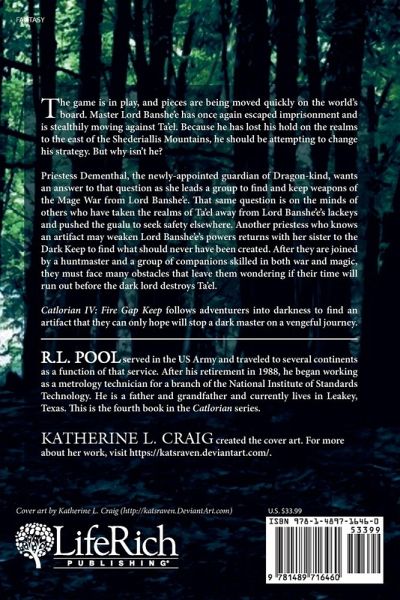 The game is in play, and pieces are being moved quickly on the worlds board. Master Lord Banshee has once again escaped imprisonment and is stealthily moving against Tael. Because he has lost his hold on the realms to the east of the Shederiallis Mountains, he should be attempting to change his strategy. But why isnt he? Priestess Dementhal, the newly-appointed guardian of Dragon-kind, wants an answer to that question as she leads a group to find and keep weapons of the Mage War from Lord Banshee. That same question is on the minds of others who have taken the realms of Tael away from Lord Banshees lackeys and pushed the gualu to seek safety elsewhere. Another priestess who knows an artifact may weaken Lord Banshees powers returns with her sister to the Dark Keep to find what should never have been created. After they are joined by a huntmaster and a group of companions skilled in both war and magic, they must face many obstacles that leave them wondering if their time will run out before the dark lord destroys Tael. Catlorian IV: Fire Gap Keep follows adventurers into darkness to find an artifact that they can only hope will stop a dark master on a vengeful journey.