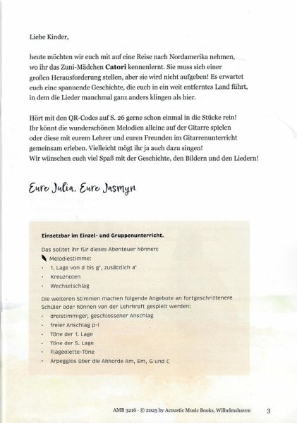 Mit Geschichten durch den Gitarrenunterricht! In einem weiteren Band der Reihe "String Stories" führt eine mitreißende Erzählung die Kinder in die Welt der Ureinwohner Nordamerikas. Wunderschön illustriert und ausgestattet mit viel Zusatzmaterial (Videos, Aufnahmen mit QR-Codes, Kreativteil, pädagogischen Tipps und, und, und ...). Die Geschichte umrahmt acht Kompositionen der Worpsweder Musikwerkstatt. Darunter befinden sich - erstmals bearbeitet für den Gitarrenunterricht - Klassiker wie "Adler will fliegen" und Perlen wie "Evening rise, Spirit come".Die stimmungsvollen Bearbeitungen bieten für den Gruppenunterricht Gitarrenparts in unterschiedlichen Niveaus an. Leichtes Lagenspiel, mehstimmige Begleitungen, Flageolett-Töne und viels mehr machen die zwei- bis fünstimmigen Stücke auch für fortgeschrittene Schüler interessant. Die erste Stimme bewegt sich dabei durchweg in der 1. Lage und liegt als Einlage in größerer Notenschrift bei, so dass das Heft gut im Einzelunterricht verwendet werden kann.Ein wunderschönes Buch, das Abwechslung in den Gitarrenunterricht bringt und zum Üben motiviert.weitere Infos auf der Website der Autorin jasmyncordesblohm.deNoten (Partitur und Text), DIN A4, 40 Seiten, plus Einlage (Gitarre 1), 12 Seiten