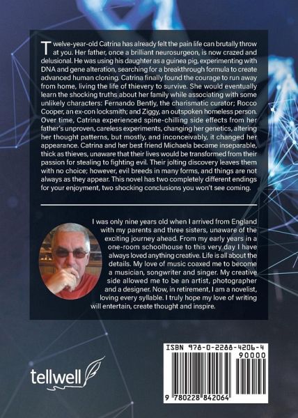 Twelve-year-old Catrina has already felt the pain life can brutally throw at you. Her father, once a brilliant neurosurgeon, is now crazed and delusional. He was using his daughter as a guinea pig, experimenting with DNA and gene alteration, searching for a breakthrough formula to create advanced human cloning. Catrina finally found the courage to run away from home, living the life of thievery to survive. She would eventually learn the shocking truths about her family while associating with some unlikely characters: Fernando Bently, the charismatic curator; Rocco Cooper, an ex-con locksmith; and Ziggy, an outspoken homeless person. Over time, Catrina experienced spine-chilling side effects from her father's unproven, careless experiments, changing her genetics, altering her thought patterns, but mostly, and inconceivably, it changed her appearance. Catrina and her best friend Michaela became inseparable, thick as thieves, unaware that their lives will be transformed from their passion for stealing to fighting evil. Their jolting discovery leaves them with no choice; however, evil breeds in many forms, and things are not always as they appear.This novel has two completely different endings for your enjoyment, two shocking conclusions you won't see coming.