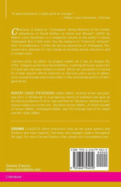 "A good conscience is eight parts of courage." -Robert Louis Stevenson, Catriona Catriona: A Sequel to "Kidnapped-Being Memoirs of the Further Adventures of David Balfour at Home and Abroad" (1892) by Robert Louis Stevenson is a companion volume to the author's classic Kidnapped. But it falls more into the category of "historical romance" than its predecessor. Unlike the daring adventures of Kidnapped, Stevenson here attempts to rely instead on building strong characters and a complex plot. Catriona picks up where its prequel ended-at 2 pm on August 25, 1751. It begins as the hero David…mehr