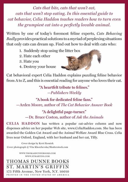 Cats that bite, cats that won't eat, cats that won't stop eating. Cat expert Celia Haddon has seen it all, and, in Cats Behaving Badly, an essential guide to cat behavior, she teaches readers how to turn even the grumpiest cat into a perfectly lovable animal. One of today's foremost feline experts, Haddon provides practical solutions to a myriad of perplexing situations that only cats can dream up in this valuable manual. Why does a cat suddenly stop using the litter box? Can an aloof kitty turn into an affectionate, cuddly cat? Is expensive cat food really worth it? The author unravels the mysteries of cat behavior and dispenses easy, affordable, and animal-friendly solutions to help both cats and their owners live happier lives. From kittens to senior cats, Haddon explains feline behavior that has puzzled cat owners for decades in this manual, including true-life and humorous cat tales that help illustrate her advice. This charming and informative handbook is essential reading for anyone who has ever asked, "Why in the world does my cat do that?"
