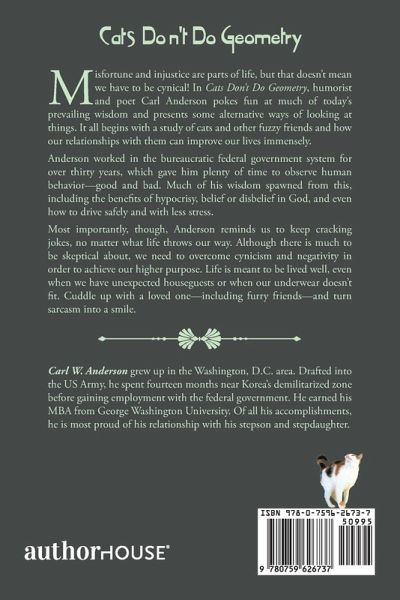 Misfortune and injustice are parts of life, but that doesn't mean we have to be cynical! In Cats Don't Do Geometry, humorist and poet Carl Anderson pokes fun at much of today's prevailing wisdom and presents some alternative ways of looking at things. It all begins with a study of cats and other fuzzy friends and how our relationships with them can improve our lives immensely. Anderson worked in the bureaucratic federal government system for over thirty years, which gave him plenty of time to observe human behavior-good and bad. Much of his wisdom spawned from this, including the benefits of hypocrisy, belief or disbelief in God, and even how to drive safely and with less stress. Most importantly, though, Anderson reminds us to keep cracking jokes, no matter what life throws our way. Although there is much to be skeptical about, we need to overcome cynicism and negativity in order to achieve our higher purpose. Life is meant to be lived well, even when we have unexpected houseguests or when our underwear doesn't fit. Cuddle up with a loved one-including furry friends-and turn sarcasm into a smile.