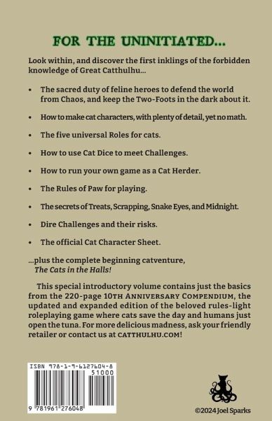 Quick Start! This special introductory volume contains just the basics from the 220-page 10th Anniversary Compendium for CATS OF CATTHULHU: the updated and expanded edition of the beloved rules-light roleplaying game where cats save the day and humans just open the tuna. For more delicious madness, ask your friendly retailer or contact us at CATTHULHU.COM!