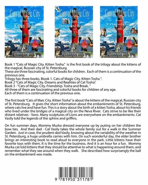 These are three fascinating, colorful books for children. Each of them is a continuation of the previous one. Trilogy has three books. Biook 1. Cats of Magic City. Kitten Tosha ". Book 2 "Cats of Magic City. Dreams and Realities of Cat Tosha". Book 3 - "Cats of Magic City. Friendship. Tosha and Break. " All three of them are fascinating and colorful books for children of any age. Each of them is a continuation of the previous one. The first book "Cats of Magic City. Kitten Tosha" is about the kittens of the magical, Russian city of St. Petersburg. It gives the short information about the…mehr