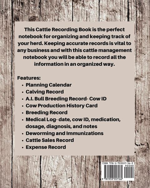 This Cattle Recording Book is the perfect notebook for organizing and keeping track of your herd. Keeping accurate records is vital to any business and with this cattle management notebook you will be able to record all the information in an organized way. Features:Planning Calendar- space to write 12-month planning details Calving Record- details for the calf, cow and sir ID, birthdate, sex, calf ease, calf vigor, birth weight, nursed (yes/no), weaning weight, weaning date, cow BCS, and notes A.I. Bull Breeding Record- Cow ID, date, 1st service, Bull ID, estimate calving date, 2nd service, estimate calving date, and AI tech Cow Production History Card- cow registration #, description (color/breed), cow's sire, dam, birth date, purchase date, sir and dam breed, weaning weight, the purchase price Breeding Record- weight at first service (KGS), age at first service (days), heat dates, date of A.I/Bull service, preg. diagnosis date, date to dry, date due to calf Cow ID#- date of sale or removal, reason, sale weight, the sale price/lb, total value, age at first calving (days), age at conception (days), date calved, calf sex, calving internal (days), notes Medical Log- date, cow ID, medication, dosage, diagnosis, and notes Deworming and Immunizations- date, cow ID, dosage, next due, and notes Cattle Sales Record- date, class of cattle, ID number, weight, the price per pound, the total price Expense Record- Expense Item: date, description, feed, supplies, medical, other, total cost, total expenses, net profit or loss Notes- record information regarding farming supplies, current and future market trends, climate and weather patterns, soil quality, feed management, etc. Details:Size: 8" x10" Pages: 150 Paperback Matte finish Order this book today to start recording all the necessary information about your farming operations. Makes a perfect gift for cattlemen, ranchers, farmers, and small breeders.