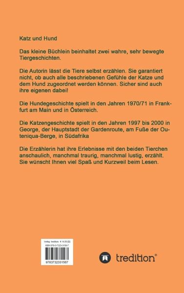 Die Autorin lässt die Tiere selbst erzählen. Sie garantiert nicht, ob auch alle beschriebenen Gefühle der Katze und dem Hund zugeordnet werden können. Sicher sind auch ihre eigenen dabei!