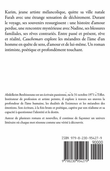 Karim, jeune artiste mélancolique, quitte sa ville natale Farah avec une étrange sensation de déchirement. Durant le voyage, ses souvenirs ressurgissent : une histoire d'amour perdue, une rencontre mystérieuse avec Nadine, ses blessures familiales, ses rêves contrariés. Entre passé et présent, rêve et réalité, Cauchemars explore les méandres de l'âme d'un homme en quête de sens, d'amour et de lui-même. Un roman intimiste, poétique et profondément touchant.