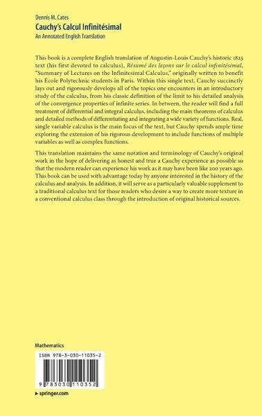 This translation maintains the same notation and terminology of Cauchy's original work in the hope of delivering as honest and true a Cauchy experience as possible so that the modern reader can experience his work as it may have been like 200 years ago. This book can be used with advantage today by anyone interested in the history of the calculus and analysis. In addition, it will serve as a particularly valuable supplement to a traditional calculus text for those readers who desire a way to create more texture in a conventional calculus class through the introduction of original historical sources.