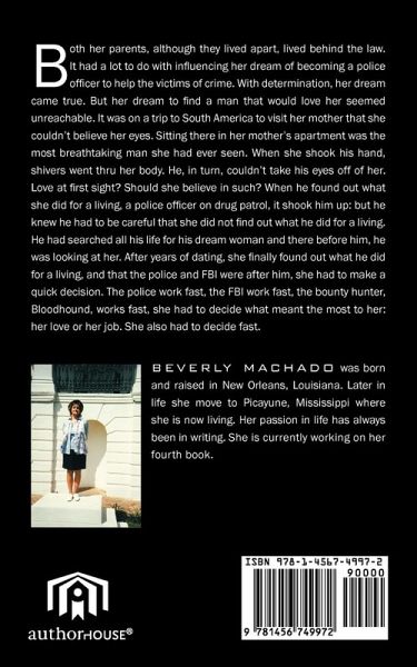 Both her parents, although they lived apart, lived behind the law. It had a lot to do with influencing her dream of becoming a police officer to help the victims of crime. With determination, her dream came true. But her dream to find a man that would love her seemed unreachable. It was on a trip to South America to visit her mother that she couldn't believe her eyes. Sitting there in her mother's apartment was the most breathtaking man she had ever seen. When she shook his hand, shivers went thru her body. He, in turn, couldn't take his eyes off of her. Love at first sight? Should she believe in such? When he found out what she did for a living, a police officer on drug patrol, it shook him up: but he knew he had to be careful that she did not find out what he did for a living. He had searched all his life for his dream woman and there before him, he was looking at her. After years of dating, she finally found out what he did for a living, and that the police and FBI were after him, she had to make a quick decision. The police work fast, the FBI work fast, the bounty hunter, Bloodhound, works fast, she had to decide what meant the most to her: her love or her job. She also had to decide fast.