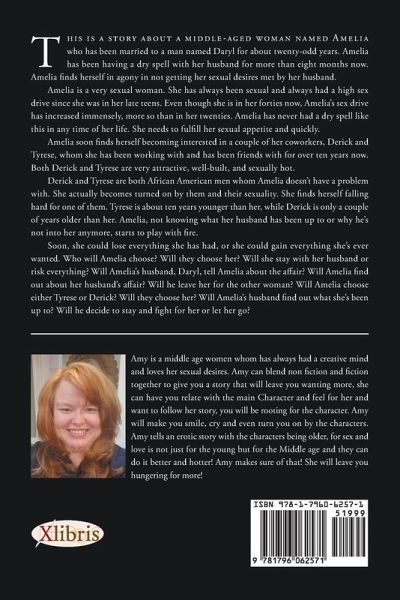 This is a story about a middle-aged woman named Amelia who has been married to a man named Daryl for about twenty-odd years. Amelia has been having a dry spell with her husband for more than eight months now. Amelia finds herself in agony in not getting her sexual desires met by her husband. Amelia is a very sexual woman. She has always been sexual and always had a high sex drive since she was in her late teens. Even though she is in her forties now, Amelia's sex drive has increased immensely, more so than in her twenties. Amelia has never had a dry spell like this in any time of her life. She needs to fulfill her sexual appetite and quickly. Amelia soon finds herself becoming interested in a couple of her coworkers, Derick and Tyrese, whom she has been working with and has been friends with for over ten years now. Both Derick and Tyrese are very attractive, well-built, and sexually hot. Derick and Tyrese are both African American men whom Amelia doesn't have a problem with. She actually becomes turned on by them and their sexuality. She finds herself falling hard for one of them. Tyrese is about ten years younger than her, while Derick is only a couple of years older than her. Amelia, not knowing what her husband has been up to or why he's not into her anymore, starts to play with fire. Soon, she could lose everything she has had, or she could gain everything she's ever wanted. Who will Amelia choose? Will they choose her? Will she stay with her husband or risk everything? Will Amelia's husband, Daryl, tell Amelia about the affair? Will Amelia find out about her husband's affair? Will he leave her for the other woman? Will Amelia choose either Tyrese or Derick? Will they choose her? Will Amelia's husband find out what she's been up to? Will he decide to stay and fight for her or let her go?