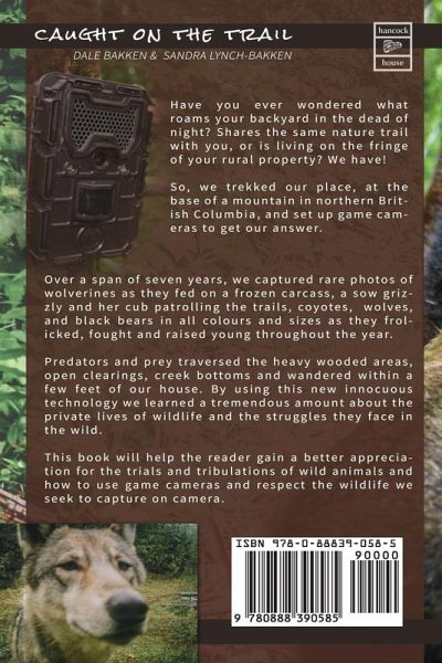 Have you ever wondered what roams your backyard in the dead of night? Shares the same nature trail with you, or is living on the fringe of your rural property? We have. So, we trekked our property, at the base of a mountain in northern British Columbia, and set up game cameras to get our answer! Over a span of seven years, we captured rare photos of wolverines as they fed on a frozen carcass, a sow grizzly and her cub patrolling the trails, coyotes, wolves, and black bears in all colours and sizes as they frolicked, fought and raised young throughout the year. Predators and prey traversed the heavy wooded areas, open clearings, creek bottoms and wandered within a few feet of our house. By using this new innocuous technology we learned a tremendous amount about the private lives of wildlife and the struggles they face in the wild. This book will help the young reader gain a better appreciation for the trials and tribulations of wild animals and how to use game cameras and respect the wildlife we seek to capture on camera.