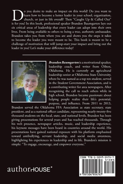 Do you desire to make an impact on this world? Do you want to learn how to become a better leader in your school, organization, church, or just in life overall? Then "Caught Up & Called Out" is for you! In this book, professional speaker Brandon Baumgarten lays out six critical areas of leadership that every leader can adopt into their own lives. From being available to others to being a true, authentic ambassador, Brandon takes you from where you are and shows you the steps it takes to become the leader you were meant to be. This book is meant to be a challenge of motivation that will jump-start your impact and bring out the leader in you! Let's make your difference today!