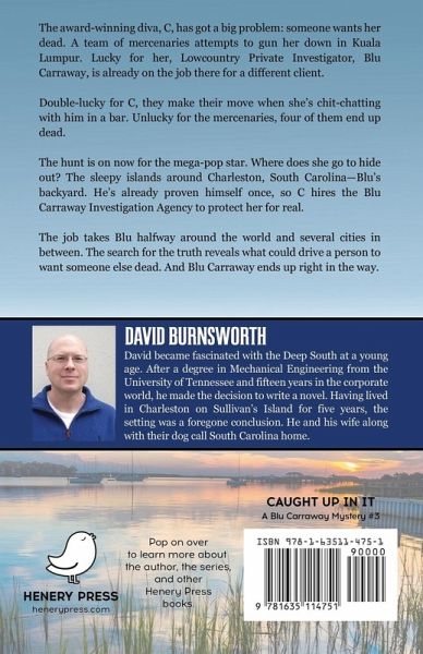 The award-winning diva, C, has got a big problem: someone wants her dead. A team of mercenaries attempts to gun her down in Kuala Lumpur. Lucky for her, Lowcountry Private Investigator, Blu Carraway, is already on the job there for a different client. Double-lucky for C, they make their move when she's chit-chatting with him in a bar. Unlucky for the mercenaries, four of them end up dead. The hunt is on now for the mega-pop star. Where does she go to hide out? The sleepy islands around Charleston, South Carolina-Blu's backyard. He's already proven himself once, so C hires the Blu Carraway Investigation Agency to protect her for real. The job takes Blu halfway around the world and several cities in between. The search for the truth reveals what could drive a person to want someone else dead. And Blu Carraway ends up right in the way. - - - - - - - - - - - - - CAUGHT UP IN IT by David Burnsworth A Henery Press Mystery. If you like one, you'll probably like them all.