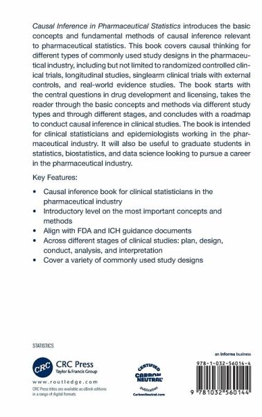 Causal Inference in Pharmaceutical Statistics introduces the basic concepts and fundamental methods of causal inference relevant to pharmaceutical statistics. This book covers causal thinking for different types of commonly used study designs in the pharmaceutical industry, including but not limited to randomized controlled clinical trials, longitudinal studies, singlearm clinical trials with external controls, and real-world evidence studies. The book starts with the central questions in drug development and licensing, takes the reader through the basic concepts and methods via different study types and through different stages, and concludes with a roadmap to conduct causal inference in clinical studies. The book is intended for clinical statisticians and epidemiologists working in the pharmaceutical industry. It will also be useful to graduate students in statistics, biostatistics, and data science looking to pursue a career in the pharmaceutical industry.