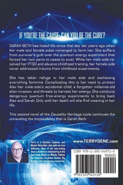 The continuation of the Sci-Fi thriller and identity arc started in Causality Bomb. If you are the cause; can you be the cure? From Terry Gene, who's first novel Kirkus Books reported "This Sci-Fi tale remains emotionally true" Sarah Beth has hated life since that day ten years ago when her male and female sides emerged to form her. She suffers from survivor's guilt over the quantum energy experiment that forced her two parts to cease to exist. While her male side resolved her PTSD and abusive childhood training, her female side never addressed trauma from childhood experiments. Sarah Beth has taken refuge in her male side and eschewing everything feminine. Complicating this is her need to protect Alex her male-side's accidental child, a forgotten millennia-old alien invasion, and threats to harvest her energy. She conducts dangerous quantum free-energy experiments to bring back Alex and Sarah. Only with her death will she find meaning in her life. This second novel of the Causality is Optional novel cycle continues the unraveling the impossibility that is Sarah Beth.