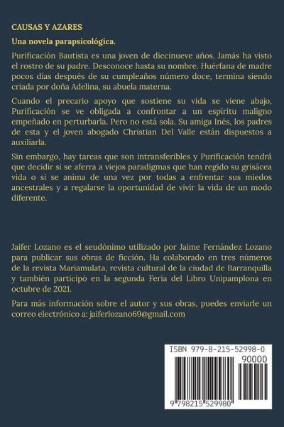 CAUSAS Y AZARES: Una novela parapsicológica. Purificación Bautista es una joven de diecinueve años. Jamás ha visto el rostro de su padre. Desconoce hasta su nombre. Huérfana de madre pocos días después de su cumpleaños número doce, termina siendo criada por doña Adelina, su abuela materna. Cuando el precario apoyo que sostiene su vida se viene abajo, Purificación se ve obligada a confrontar a un espíritu maligno empeñado en perturbarla. Pero no está sola. Su amiga Inés, los padres de esta y el joven abogado Christian Del Valle están dispuestos a auxiliarla. Sin embargo, hay tareas que son intransferibles y Purificación tendrá que decidir si se aferra a viejos paradigmas que han regido su grisácea vida o si se anima de una vez por todas a enfrentar sus miedos ancestrales y a regalarse la oportunidad de vivir la vida de un modo diferente.