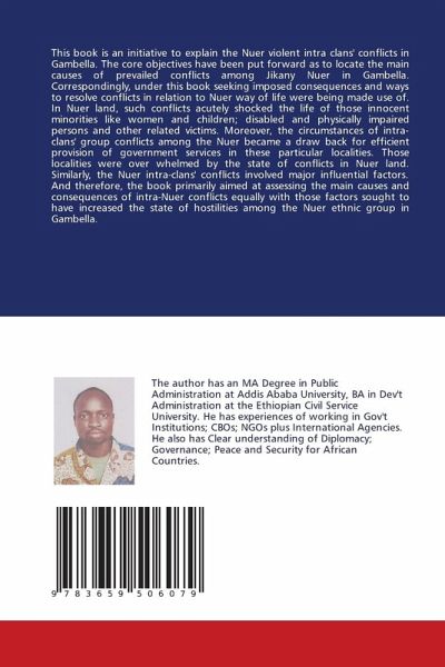 This book is an initiative to explain the Nuer violent intra clans' conflicts in Gambella. The core objectives have been put forward as to locate the main causes of prevailed conflicts among Jikany Nuer in Gambella. Correspondingly, under this book seeking imposed consequences and ways to resolve conflicts in relation to Nuer way of life were being made use of. In Nuer land, such conflicts acutely shocked the life of those innocent minorities like women and children; disabled and physically impaired persons and other related victims. Moreover, the circumstances of intra-clans' group conflicts among the Nuer became a draw back for efficient provision of government services in these particular localities. Those localities were over whelmed by the state of conflicts in Nuer land. Similarly, the Nuer intra-clans' conflicts involved major influential factors. And therefore, the book primarily aimed at assessing the main causes and consequences of intra-Nuer conflicts equally with those factors sought to have increased the state of hostilities among the Nuer ethnic group in Gambella.