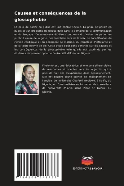 La peur de parler en public est une phobie sociale. La prise de parole en public est un problème de longue date dans le domaine de la communication et du langage. De nombreux étudiants ont essayé d'éviter de parler en public à cause de la gêne, des tremblements de la voix, de l'accélération du rythme cardiaque et du sentiment de malaise, du complexe d'infériorité et de la faible estime de soi. Cette étude s'est donc penchée sur les causes et les conséquences de la glossophobie telle qu'elle est exprimée par les étudiants de premier cycle de l'université d'Ilorin, au Nigeria.