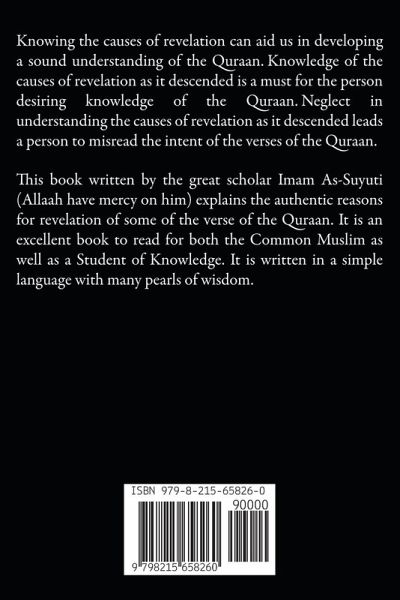 Knowing the causes of revelation can aid us in developing a sound understanding of the Quraan. Knowledge of the causes of revelation as it descended is a must for the person desiring knowledge of the Quraan. Neglect in understanding the causes of revelation as it descended leads a person to misread the intent of the verses of the Quraan. This book written by the great scholar Imam As-Suyuti (Allaah have mercy on him) explains the authentic reasons for revelation of some of the verse of the Quraan. It is an excellent book to read for both the Common Muslim as well as a Student of Knowledge. It is written in a simple language with many pearls of wisdom.