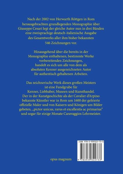 Nach der 2002 von Herwarth Röttgen in Rom herausgebrachten grundlegenden Monographie über Giuseppe Cesari legt der gleiche Autor nun in drei Bänden eine zweisprachige deutsch-italienische Ausgabe des Gesamtwerks aller ihm bisher bekannten 546 Zeichnungen vor. Hinausgehend über die bereits in der Monographie enthaltenen, bestimmte Werke vorbereitenden Zeichnungen, handelt es sich um alle von dem als absoluten Kenner ausgezeichneten Autor für authentisch gehaltenen Arbeiten. Das zeichnerische Werk dieses großen Meisters ist eine Fundgrube für Kenner, Liebhaber, Museen und Kunsthandel. Der in der Kunstgeschichte als der Cavalier d¿Arpino bekannte Künstler war in Rom um 1600 der gefeierte offizielle Maler und von Kaisern und Königen um Bilder gebeten, ¿pictor unicus, rarus et excellentis ac primarius¿ und sogar für einige Monate Caravaggios Lehrmeister.