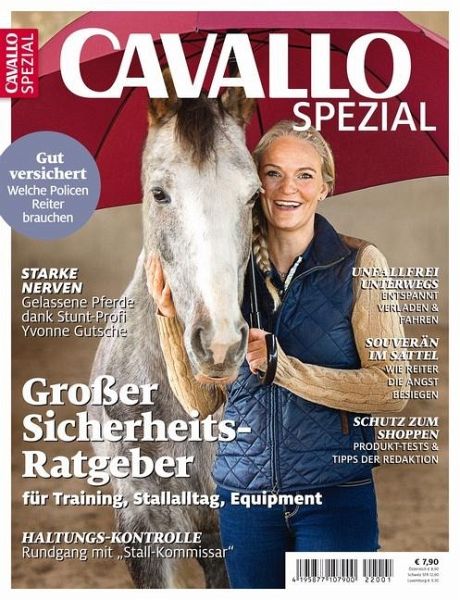 Die CAVALLO Spezial ist vollgepackt mit viel Wissen rund um die wichtigsten Sicherheitsfragen. Holen Sie sich mit diesem CAVALLO Spezial Anregungen, wie Sie die Sicherheit Ihres Vierbeiners noch besser gewährleisten können - davon profitieren Sie und Ihr Pferd gleich doppelt. CAVALLO ist Deutschlands reichweitenstärkstes Magazin für aktive Reiter.Jede Ausgabe bietet zahlreiche verbraucherorientierte Artikel von hoher Fachkompetenz. Ein großes Redaktionsteam recherchiert und berichtet unabhängig, engagiert und kritisch. CAVALLO ist bekannt für seine große Themenvielfalt mit starkem Nutzwertcharakter und praktischen Tipps.