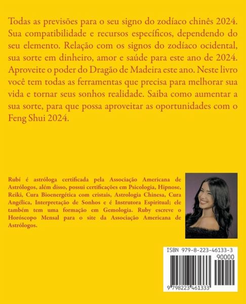 Todas as previsões para o seu signo do zodíaco chinês 2024. Sua compatibilidade e recursos específicos, dependendo do seu elemento. Relação com os signos do zodíaco ocidental, sua sorte em dinheiro, amor e saúde para este ano de 2024. Aproveite o poder do Dragão de Madeira este ano. Neste livro você tem todas as ferramentas que precisa para melhorar sua vida e tornar seus sonhos realidade. Saiba como aumentar a sua sorte, para que possa aproveitar as oportunidades com o Feng Shui 2024.