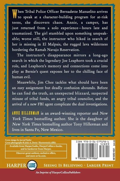 When Tribal Police Officer Bernadette Manuelito arrives to speak at a character-building program for at-risk teens, she discovers chaos. Annie, a camper, has just returned from a solo experience hours late and traumatized. The girl stumbled upon something unspeak-able; worse still, the instructor who hiked in search of her is missing in El Malpais, the rugged lava wilderness bordering the Ramah Navajo Reservation. The instructor’s disappearance mirrors a long-ago search in which the legendary Joe Leaphorn took a crucial role, and Leaphorn’s memory and connections come into play as Bernie’s quest exposes her to the chilling face of human evil. Meanwhile, Jim Chee tackles what should have been an easy assignment but deadly confusion abounds. Before he can find the truth, an unexpected blizzard, suspected misuse of tribal funds, an angry tribal councilor, and the arrival of a new FBI agent complicate the dual investigations.
