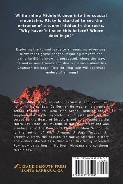Cave of the Birdman is an unforgettable adventure story of a young Chumash boy who discovers fascinating secrets about the history, culture, and traditions of his people. Ricky Lopez is living the life of his dreams! His family owns a horse ranch near Santa Barbara, California. Life revolves around his dog, Sundance, and his horse, Midnight. While riding Midnight deep into the coastal mountains, Ricky is startled to see the entrance of a tunnel hidden in the rocks. "Why haven't I seen this before? Where does it go?" Exploring the tunnel leads to an amazing adventure! Ricky faces grave danger, requiring bravery and skills he didn't know he possessed. Along the way, he makes new friends and discovers more about his Chumash heritage. Cave of the Birdman is a comprehensive teacher resource for planning a unit on Native Americans. Lesson plans can easily be created around the themes of:California geography Chumash life Chumash art Chumash traditions and celebrations Chumash culture Chumash language Chumash legends Chumash astronomy Chumash customs Chumash cosmology The website associated with the book provides additional resources and references and a means for teachers to share lesson plans. Cave of the Birdman reveals the beauty of Chumash culture and its reverence of nature. Teachers, students and readers of all ages will learn Chumash vocabulary, traditions, astronomy and material culture. This thrilling tale will captivate readers of all ages!