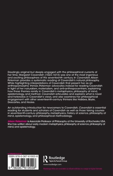 Dazzlingly original but deeply engaged with the philosophical currents of her time, Margaret Cavendish (1623-1673) was one of the most ingenious and exciting philosophers of the seventeenth century. In Cavendish, Alison Peterman provides a systematic reading of Cavendish's natural philosophy. While highlighting interpretations of Cavendish that present her as an anthropomorphic thinker, Peterman advocates instead for reading Cavendish in light of her naturalism, materialism, and anti-anthropocentrism, explaining how these themes ramify in Cavendish's metaphysics, philosophy of mind, epistemology, and method. Cavendish articulates and explains what is novel and heterodox in Cavendish's views, and also examines her philosophical engagement with other seventeenth-century thinkers like Hobbes, Boyle, Descartes, and Hooke.