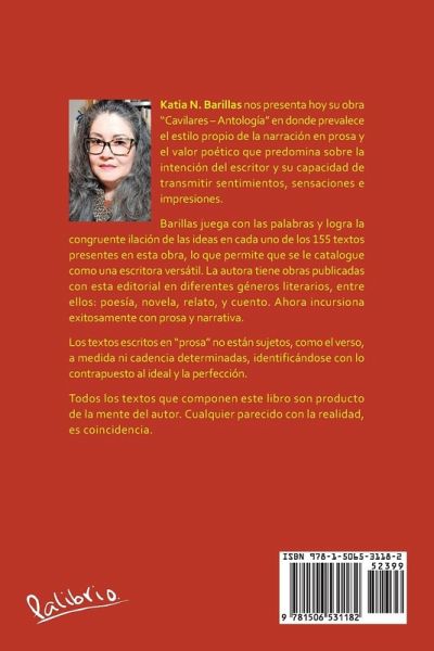 Katia N. Barillas nos presenta hoy su obra "Cavilares - Antología" en donde prevalece el estilo propio de la narración en prosa y el valor poético que predomina sobre la intención del escritor y su capacidad de transmitir sentimientos, sensaciones e impresiones. Barillas juega con las palabras y logra la congruente ilación de las ideas en cada uno de los 155 textos presentes en esta obra, lo que permite que se le catalogue como una escritora versátil. La autora tiene obras publicadas con esta editorial en diferentes géneros literarios, entre ellos: poesía, novela, relato, y cuento. Ahora incursiona exitosamente con prosa y narrativa. Los textos escritos en "prosa" no están sujetos, como el verso, a medida ni cadencia determinadas, identificándose con lo contrapuesto al ideal y la perfección. Todos los textos que componen este libro son producto de la mente del autor. Cualquier parecido con la realidad, es coincidencia.