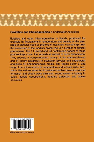 I Cavitation.- Cavitation and Coherent Optics.- On the Dynamics of Non-Spherical Bubbles.- Oscillation and Collapse of a Cavitation Bubble in the Vicinity of a Two-Liquid Interface.- Experimental Investigation of Bubble Collapse at Laser-Induced Breakdown in Liquids.- Application of High Speed Holocinematographical Methods in Cavitation Research.- Bubble Collapse Studies at a Million Frames per Second.- Holographic Generation of Multi-Bubble Systems.- The Dynamics and Acoustic Emission of Bubbles Driven by a Sound Field.- Free and Forced Oscillations of Spherical Gas Bubbles and Their Translational Motion in a Compressible Fluid.- Acoustic Cavitation and Bubble Dynamics Due to a Tension Wave.- Some New Results on Cavitation Threshold Prediction and Bubble Dynamics.- Acoustic Cavitation Thresholds in Water.- The Influence of Modest Overpressures on the Persistence of Air Bubbles in Water.- On the Collapse of Cavity Clusters in Flow Cavitation.- Effect of Polarization on Electric Pulses Produced by Cavitation Bubbles.- Cavitation Effects at Megahertz Frequencies.- Nonlinear Sound-Scattering by Small Bubbles.- Dynamics of a Cylindrical Cavity in a Boundless Compressible Liquid.- II Sound Waves and Bubbles.- Sound and Shock Waves in Bubbly Liquids.- On the Amplification of Modulated Acoustic Waves in Gas-Liquid Mixtures.- Self-Induced Transparency and Frequency Conversion Effects for Acoustic Waves in Water Containing Gas Bubbles.- Pressure Waves in a Liquid with Gas or Vapour Bubbles.- Dynamics of a Liquid with Gas Bubbles During Interaction with Short Large-Amplitude Pulses.- Shock Wave Transformation in Bubbly Liquids.- Relaxation Effects in the Propagation of Underwater Shock Waves.- III Bubble Spectrometry.- Acoustical Bubble Spectrometry at Sea.- Acoustical Scattering from Near-Surface Bubble Layers.- Density of Air-Bubbles Below the Sea Surface, Theory and Experiments.- Acoustic Measurements of the Gas Bubble Spectrum in Water.- Determination of Bubble Size Spectra by Digital Processing of Holograms.- Determination of Bubble Sizes by Far Field Diffraction of Photographic Recordings.- Complementing Discussion Contribution to the Papers of H. Medwin, Ir.P. Schippers, and A. L¿vik.- IV Partiole Detection.- Acoustical Detection of Astrophysical Neutrinos in the Ocean.- V Inhomogeneities in Ocean Acoustics.- Inhomogeneities in Underwater Acoustics.- Sound Propagation in an Inhomogeneous Ocean.- Acoustic Fluctuations in the Ocean.- Mesoscale Inhomogeneities and Turbulence in Ocean Acoustics.- On the Influence of Stochastic Sound Speed Variations on Acoustic Transmission Loss in Shallow Water.- The Inverse Backscattering Problem ¿ a Different Approach.- Index of Contributors.