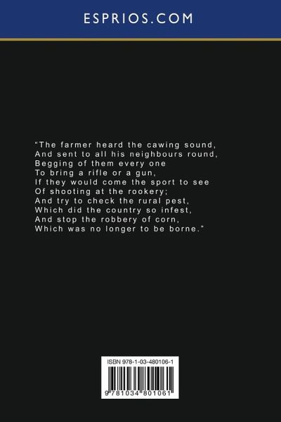 "The farmer heard the cawing sound, And sent to all his neighbours round, Begging of them every one To bring a rifle or a gun, If they would come the sport to see Of shooting at the rookery; And try to check the rural pest, Which did the country so infest, And stop the robbery of corn, Which was no longer to be borne."
