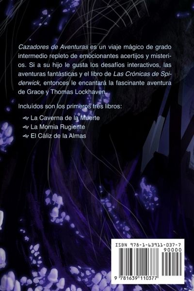 Cazadores de Aventuras es una serie de aventuras de fantasía para preadolescentes que presenta a Eevie, Tommy y Drew. Sigue el viaje de estos adolescentes a un mundo oculto, lleno de hechiceros malvados, monstruos y demonios, liderado por una reina insaciable con sed de almas humanas. ¿Podrán poner fin a su mortífero reinado antes de que sea demasiado tarde? Este conjunto exclusivo incluye los primeros tres libros de la serie:La Caverna de la Muerte La Momia Rugiente El Cáliz de la Almas